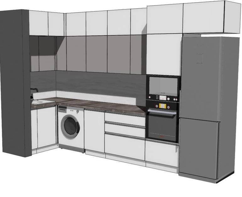 2. Тут в углу СМ. Учитывая размер рабочей поверхности, у меня, есть сомнения в этом специалисте. А ведь женщина... Привлекателен вариант тем, что чайник и мелочи можно в угол на см поставить... Верхних шкафов по короткой стене не будет.
