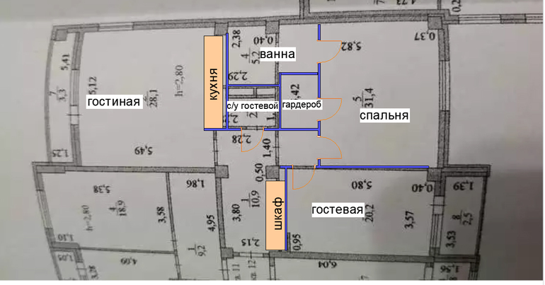Комнату 28,1 сделать спальней. От комнаты 31,4 откусить для увеличения кухни (чтобы и кухня была там, где она задумана), а остаток от комнаты 31,4 сделать гостевую.