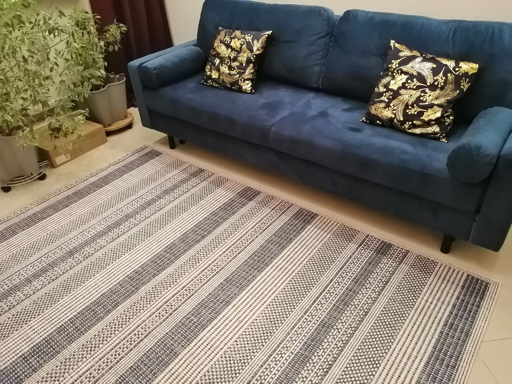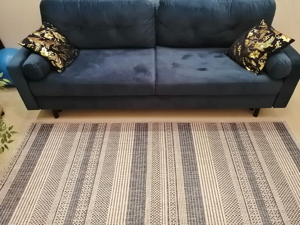 Тоже занялась обустройством гостиной и тоже есть там синий диван, сегодня вот только коврик купили.