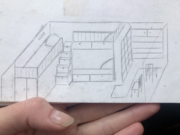 Чтобы под одной кроватью у двери как раз была просторная гардеробная. Сразу экономим место в комнате, чтобы не громоздить шкафы и заодно все вмещаем в одно место. Кроме того у каждого будет своё личное гнездышко, каждому хочу провести свет и сделать полочку, чтобы могли читать на своём спальном месте или «спрятаться» от других. вот примерный эскиз этой стены нарисовала