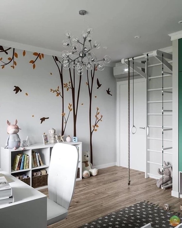 В углу за дверью планирую лаконичную шведскую стенку- желание детей. И за дверью открытой будет ее не видно. Планирую так же белого цвета, как мебель.