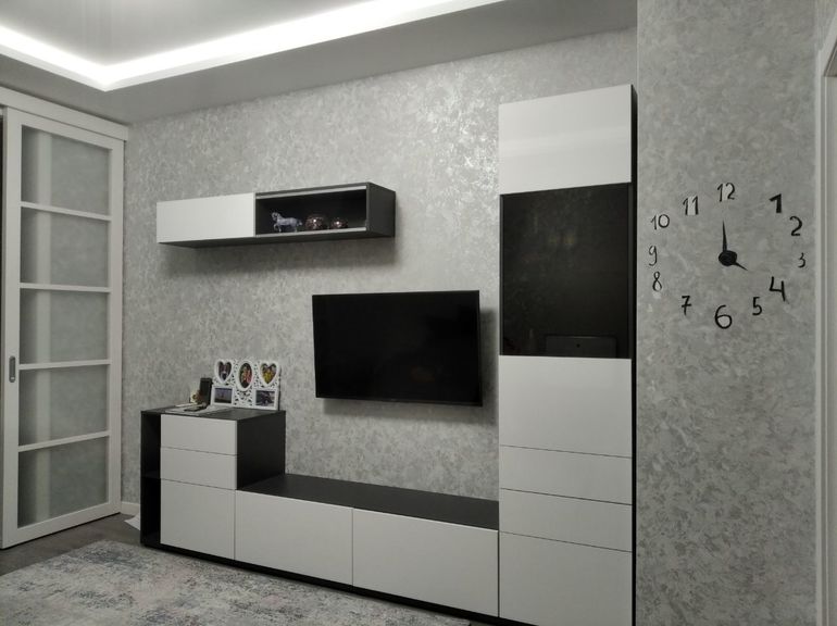 Нет зала. Есть крохотная и без того комната, которую эти цвета делают еще меньше. Выделила бы колонну фото, может какие-то рамки, если часы, то светлее и не огромные
