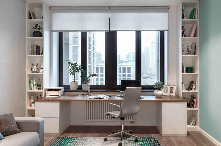 Тумбы хочу выкатные и поставить посередине, т.о. разграничив рабочие места. Для спасения от батарей - отверстия в столешнице. Для спасения от прямых лучей солнца - рулонные жалюзи.