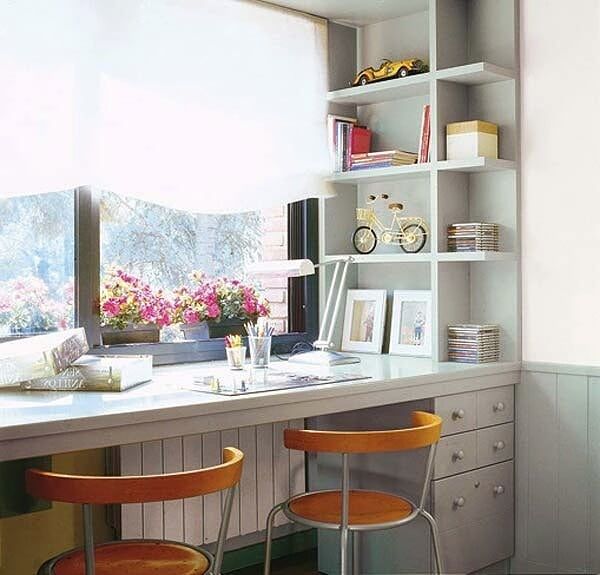 Мы когда-то с сестрой сидели у окна, и у нас два одинаковых стола стояли в ряд. Но мы все-время болтали, отвлекались... Учиться было невозможно! Потом расставили эти столы спиной к друг-другу и так стало более возможным концентрироваться;