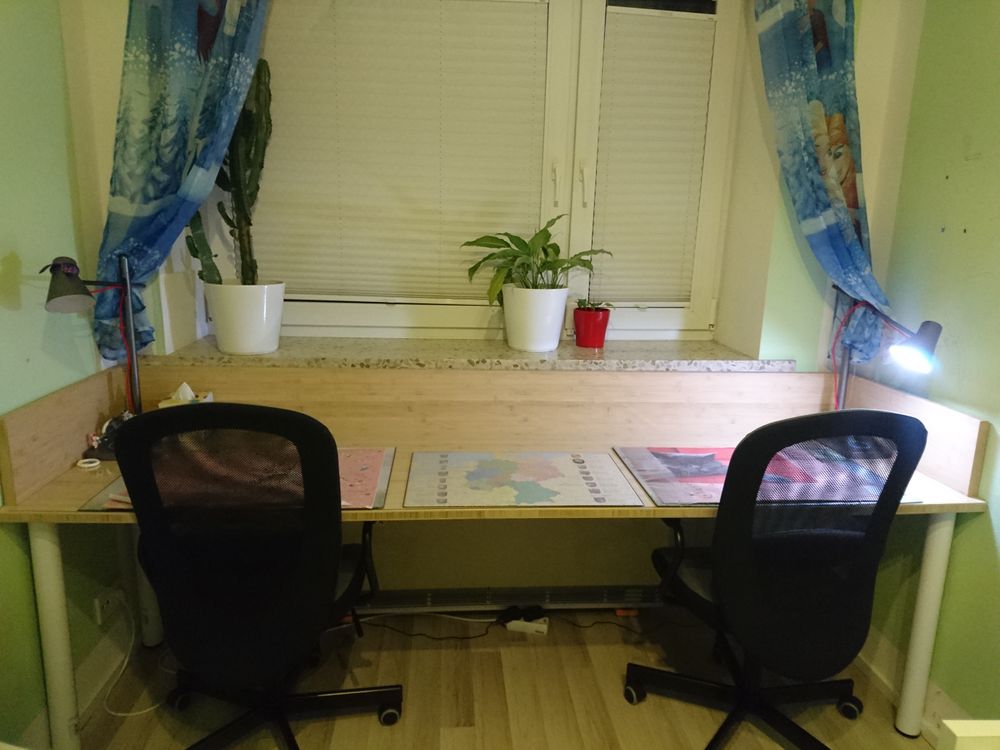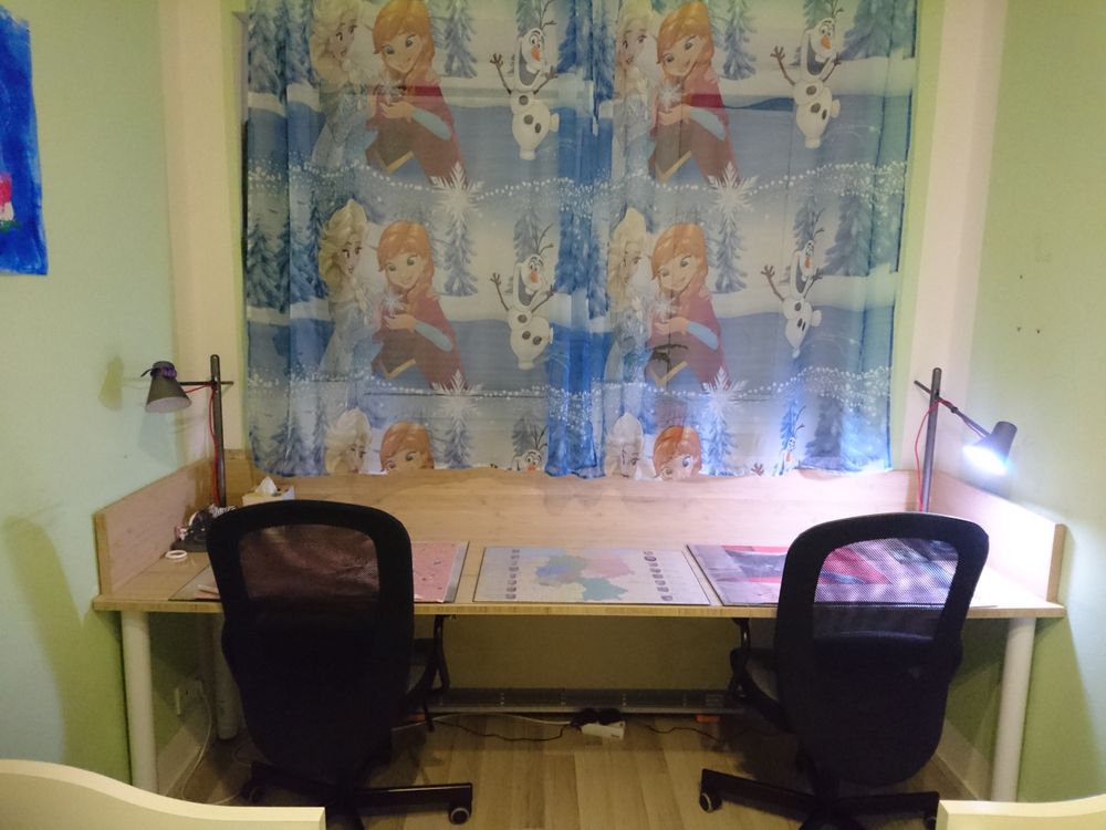 Как вы видите, комната маленькая. Благодаря этому столу дети могут свободно сидеть. Ещё не доработано- нужны полки, или что-то подобное.