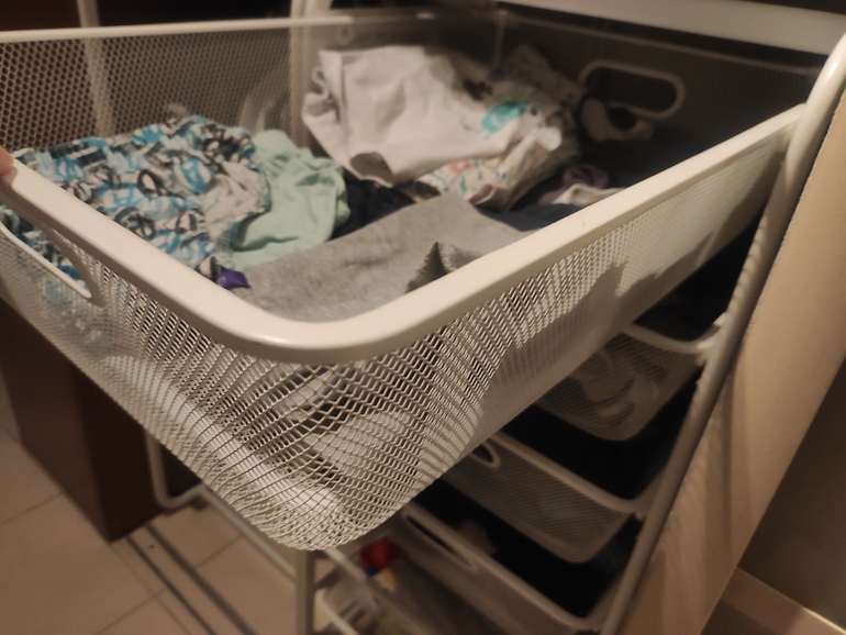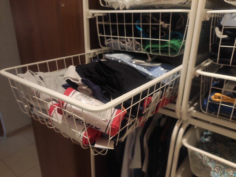 Белье по корзинкам разложено (икеевские органайзеры для шкафов) и в ящики комода поставлено. Под мужские носки у нас отдельный большой икеевский короб - так уж повелось)))