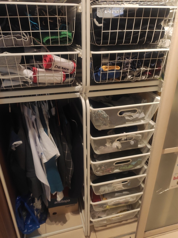 Носки/трусы у детей в шкафах в детских. У младшего в выдвижной корзине просто лежит стопками, у старшего в коробочках икейских небольших. У меня и у мужа в ящиках в гардеробной. У меня с органайзером из икеа, у мужа просто стопками лежит все.