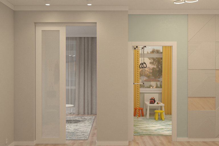 Далее дверь в детскую спальню и спальню родителей.Напротив спальни дверь в душевую.