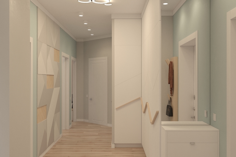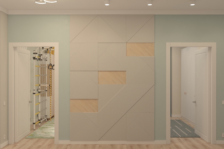 Проект коридора был такой. Напротив входной двери вход на кухню-гостиную, правее дверь в игровую.