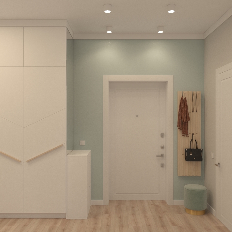В коридоре большой угловой шкаф,тумба с зеркалом, открытая вешалка и пуф.