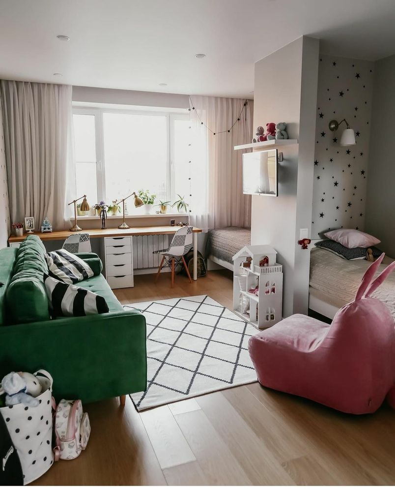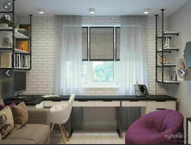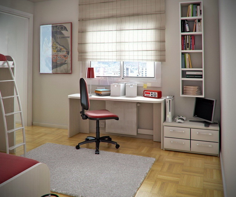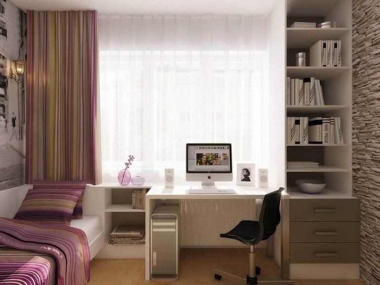 Вот вариант тоже очень похожий на мой - у окна стол, стеллаж и кровать. И оставлены шторы, причем двойные, только короткие. Вам нравится?