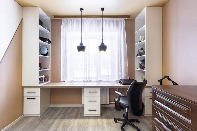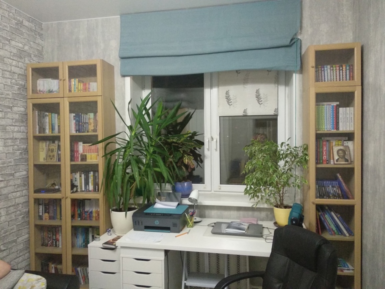 Я долго пыталась понять, в чем сложность, почему ничего не нравится. И поняла, что рулонные/римские шторы идеально смотрятся там, где рабочая зона у окна НЕ ИМЕЕТ свободных стен справа и слева, где окно граничит со стеллажами. Вот напр.: