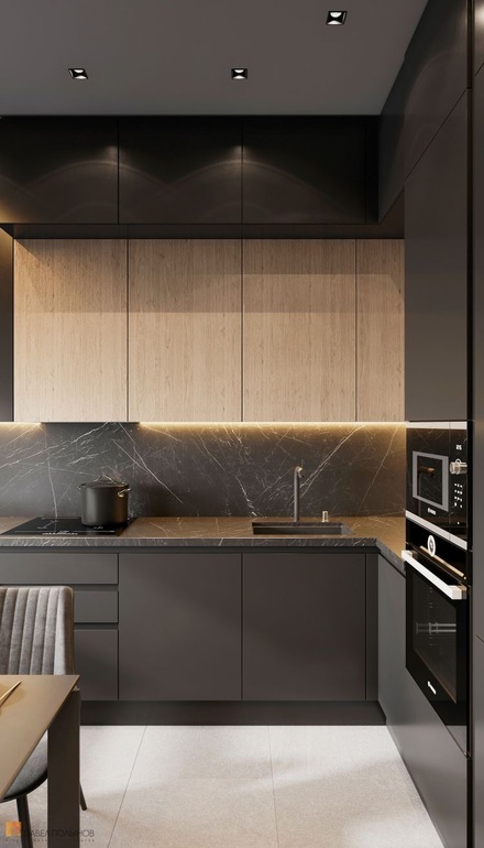 Темная кухня без светлого пола просто «съест» больше визуального пространства и будет «давить» своим цветом. Такой рисунок плитки подошёл бы, если бы Вы делали белую столешницу и фартук, чтоб была игра контрастов и подобная плитка поддержала бы констрастные цвета.