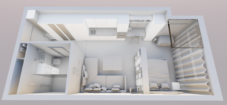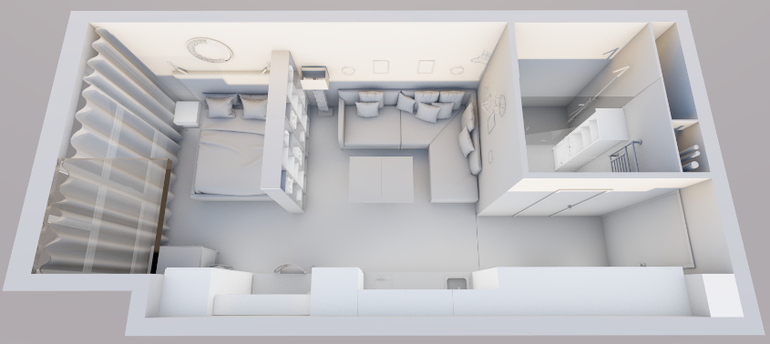 Ирина, добрый день! Как можно увидеть на 3d-плане, кровать отделена стеллажами. Но заказчик решил сделать перегородку. Наверное, чтобы как-то зонировать спальню.)