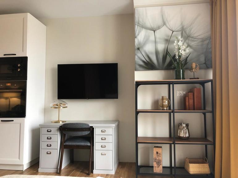 Телевизор можно было повесить напротив дивана, используя, например, Т-образную вытяжку, но заказчик пожелал над письменным столом. Телевизор крепится на поворотном кронштейне. Перед диваном стол-трансформер такого типа: