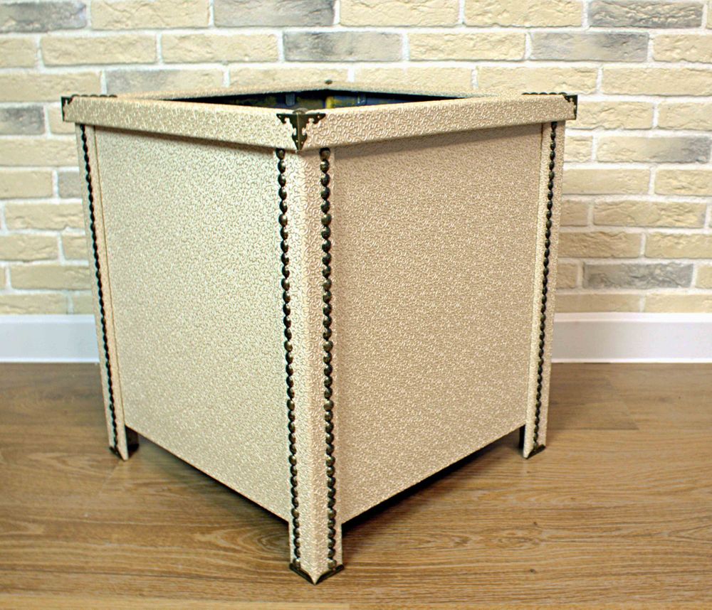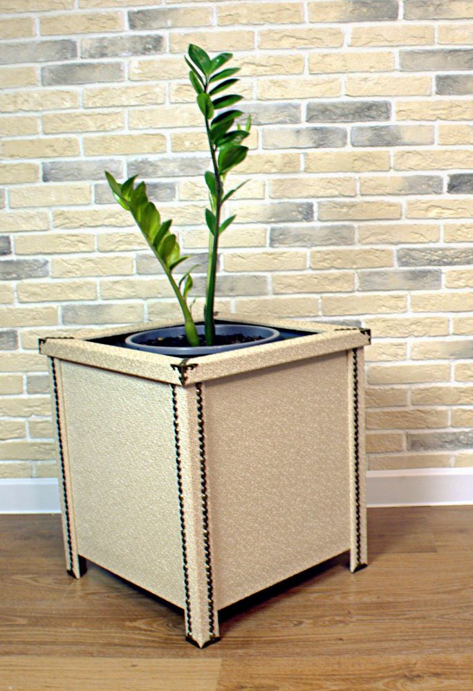 Кашпо выполнено из фанеры, отделано бежевой экокожей с цветочным орнаментом, латунный декор под состаренное золото придает изделию неповторимый вид и элегантность. Изнутри кашпо декорировано (покрашено) по технологии патенирования под состаренное золото, что гармонирует с общей концепцией изделия. Внутри сделала полка под горшок.