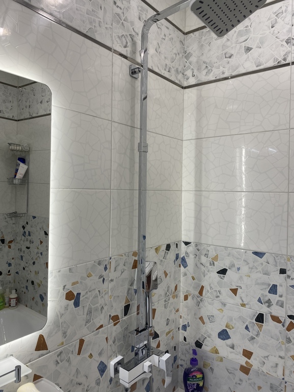 Шкаф зеркальный над раковиной. Но дело в том, что там хотели сделать душ на штанге и ручной. Будет ли удобно пользоваться, есть ли такие штанги, чтобы между креплениями было 63 см (зеркало в высоту получается 62,5 см). И нужно ли как-то по особому готовить стену для зеркала, какое нужно зеркало, чтобы не потемнело. Что в первую очередь делать: зеркало или плитку?