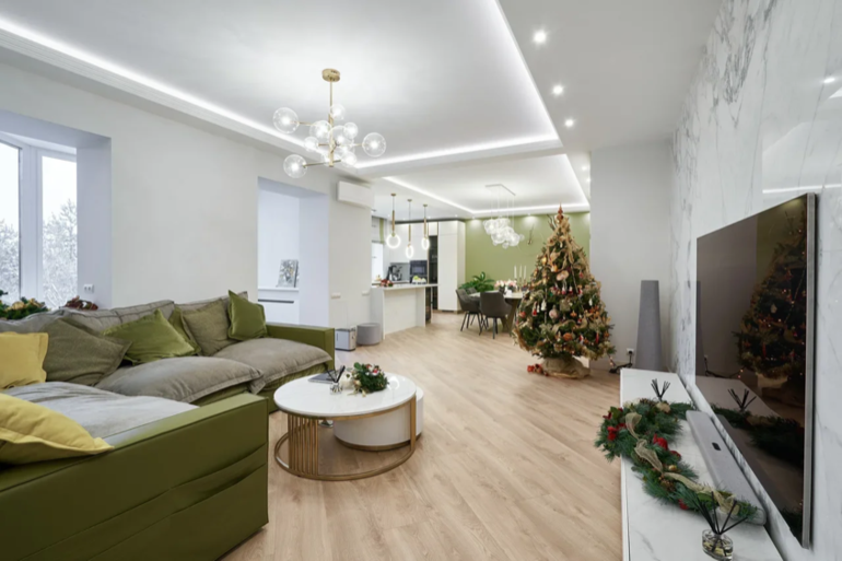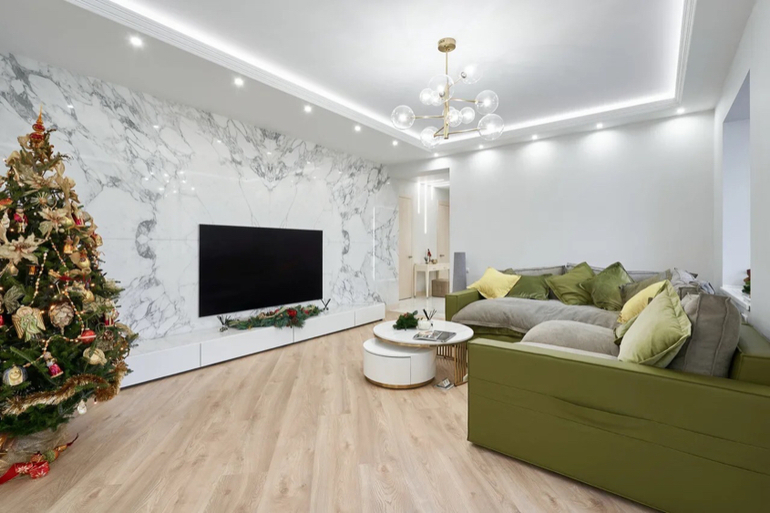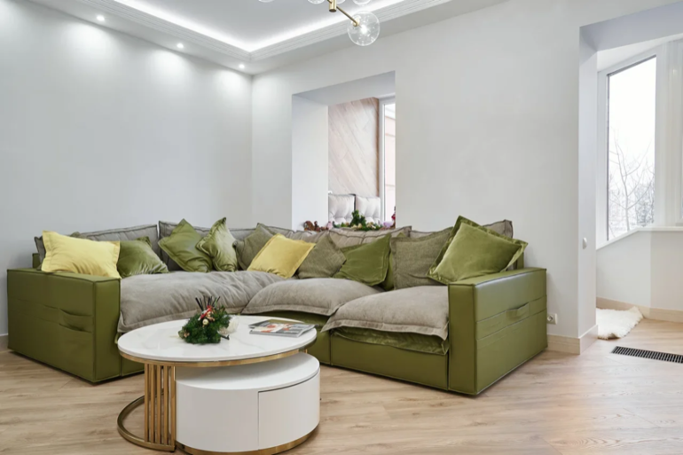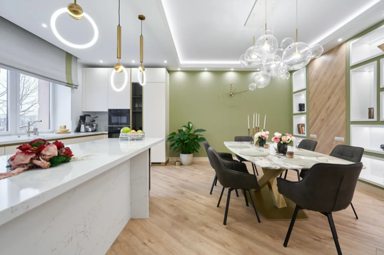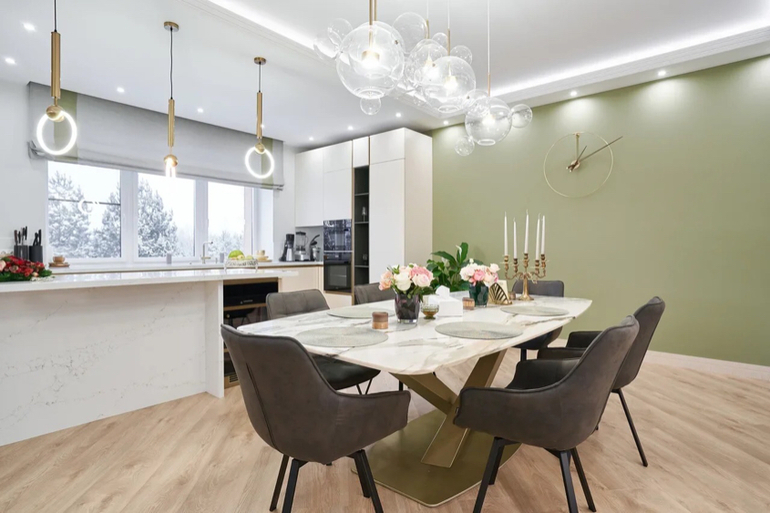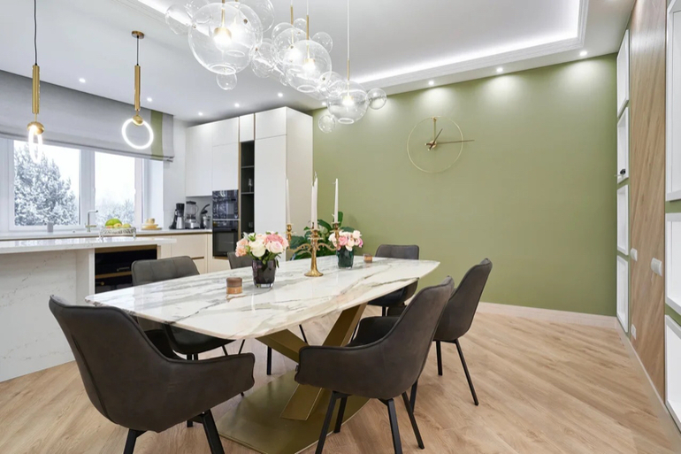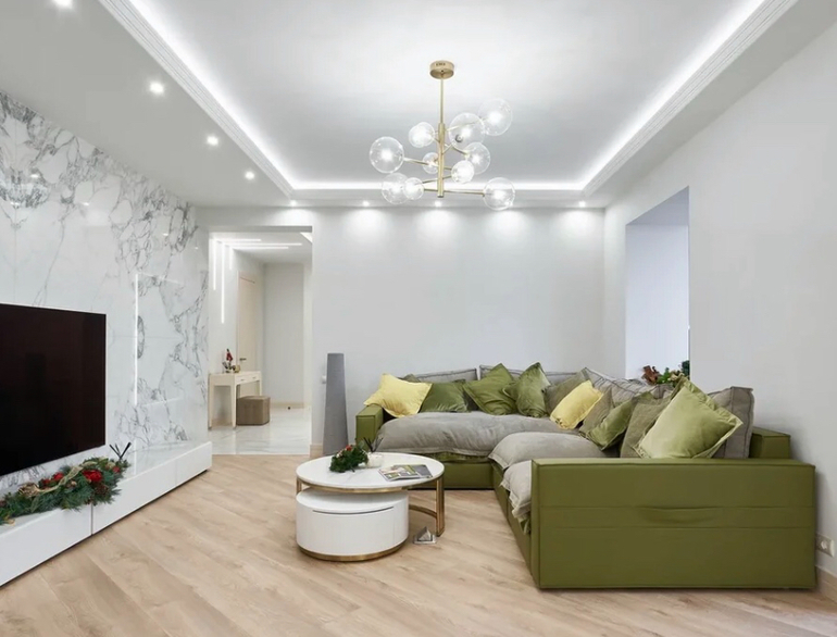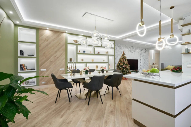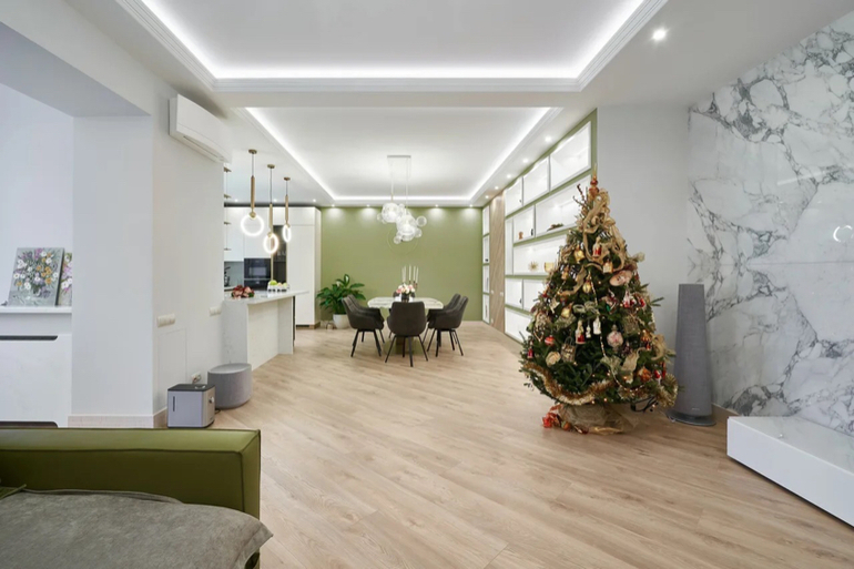 Белый цвет - это было строгое желание заказчика. Даже уговорить его на зелёную стену в гостиной стоило больших трудов). Там ещё планируется декор на стенах и ковры.