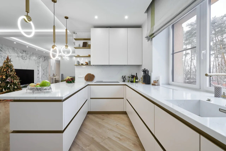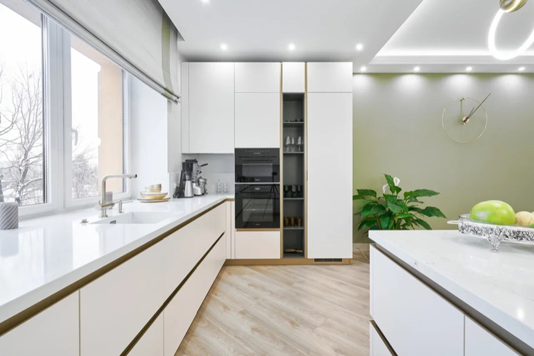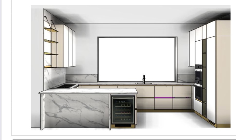 Кухня получилась очень просторная, она не полностью П образная и в плане эргономики там всё рассчитано и удобно. Главное заказчики очень довольны).