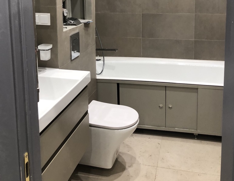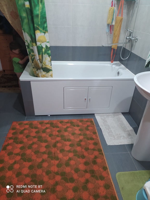 Обычный какой то экран, выкрашенный краской под цвет керамогранита на стенах. Хотела тоже керамогранит, но там возникли техн. сложности кое что не продумала и сделали так. Обычную ванну надо закрывать все таки, если у Вас не специальная отдельно стоящая ванна. P.s. у нас ещё недоделана ванна, поэтому сорри за фото