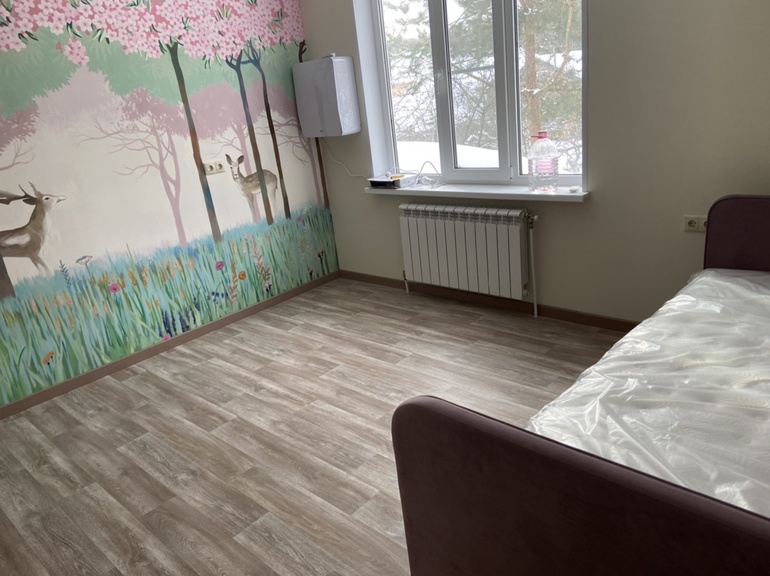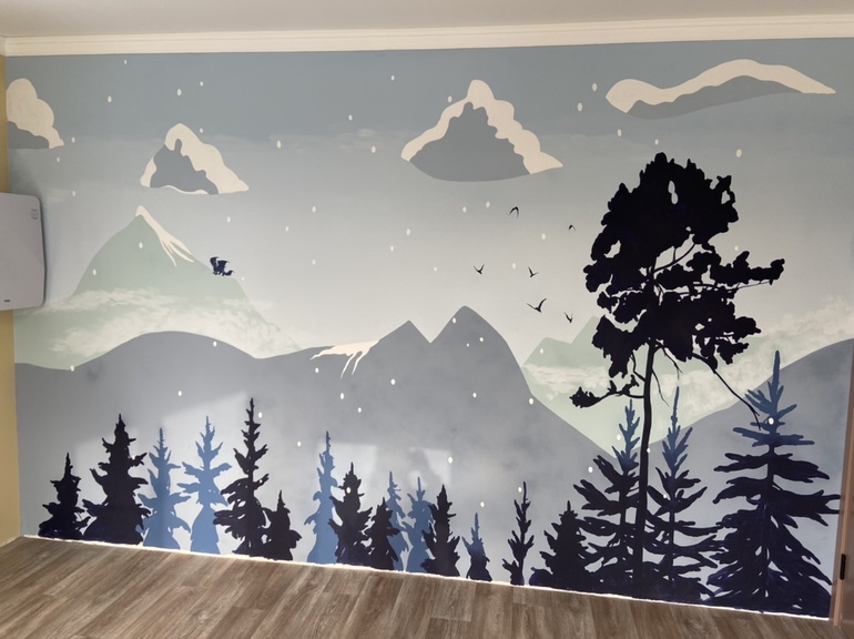 Это все краска. Сначала просто 4 стены покрасили, а потом художник нарисовала нам эту прелесть. Вообще мы ее приглашали ради комнаты старшего, там горы, которые я в интернете подглядела. Что дочке рисовать - не знали, и хотели наклейками обойтись, но попросили совета у художницы, и она показала похожую работу - и все в семье затопали ногами и завопили, что такая стена нам нужна 😂 вот теперь она у нас есть))) По моей просьбе роспись покрыли матовым лаком (воняло знатно сутки), зато теперь можно мыть. А вот остальными стенами крашеными я не довольна. Может быть, потому что мебели нет, но заляпано все жутко (особенно там, где лестница). Не знаю, долго ли проживем с этой краской ((((