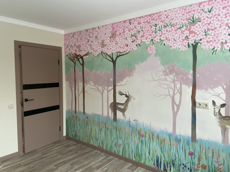 Добрый день! Очень красивые стены у вас получились, я в восторге! Можно спросить сколько по цене вышло? И попросить телефон художницы😊