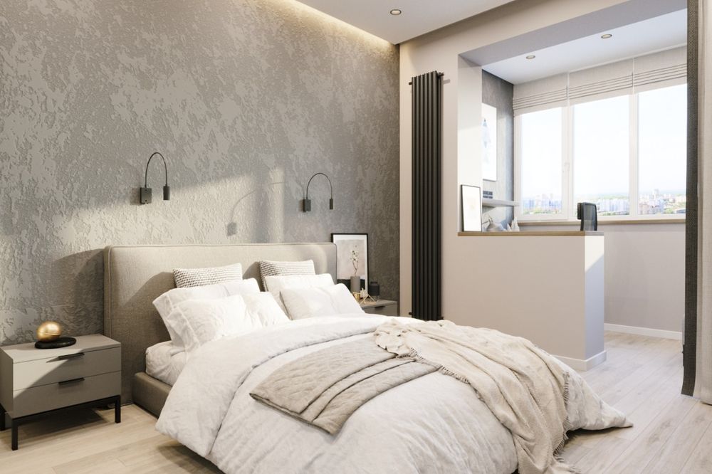 Доброй ночи! Для такой раздвижной двери давно существует скрытый механизм. Такой радиатор Вам дорого обойдется, можно взять дизайнерский , но обычной высоты. На мой взгляд в этой спальне не хватает жизни).