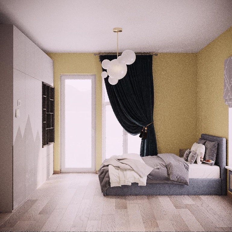 Фотки комнаты есть, но цвет не передают. Вот визуализация, там цвет стен близок к реальному (в жизни желтее). Но Шторы и шкаф другие абсолютно будут, кровать отдаленно похожая