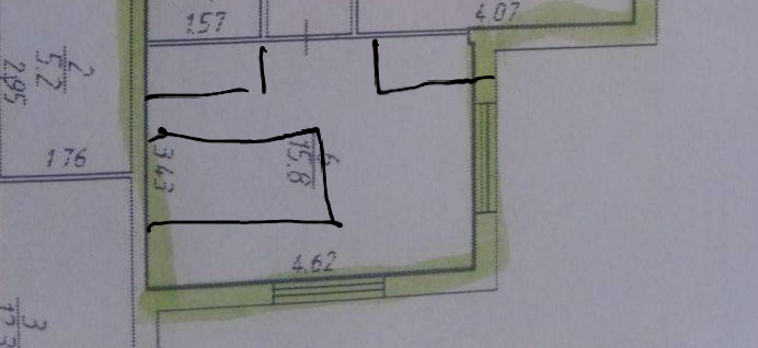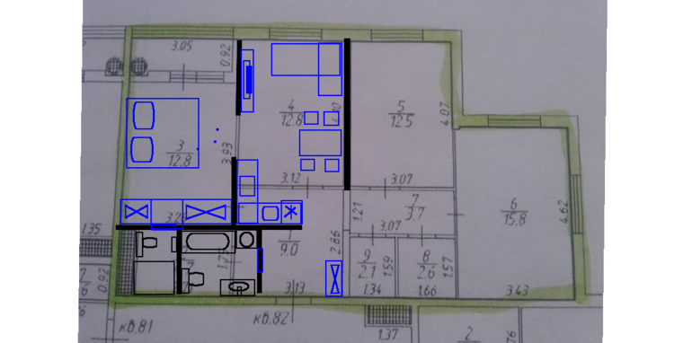 Я так понимаю, что сверху вниз идёт комната с балконом, кухня и две комнаты?