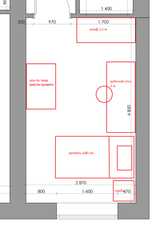 Ниже я прикинула (очень топорно) расстановку мебели, все подписано. Давайте пообсуждаем. В целом мне все кажется логичным, смущает отсутствие места "посидеть принять гостей", но практика жилья в нынешней комнате показывает, что на "диване для гостей" живет гитара, подвесное кресло не используется: вся жизнь у человека протекает на кровати либо за столом.