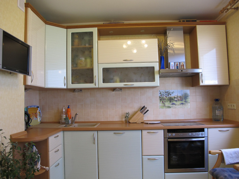Не поняла будет ли в итоге у вас встроенная вытяжка? У нас вот так. На фото плохо, наверное, видно : средний ярус шкафов все распашные, но узкие