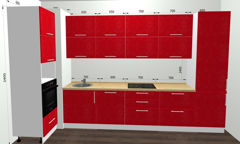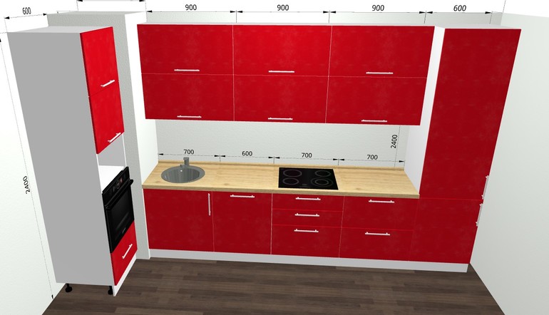 Ирина, спасибо большое за фото, но у Вас ящики не огромные, они по высоте достаточно компактные, у меня получается каждый 48 см высотой. Рабочая поверхность от мойки до варки 80 см, я думаю хватит, у меня сейчас также. Мусорное ведро под мойкой. Нарисовала Ваш проект, вытяжку так не поставить