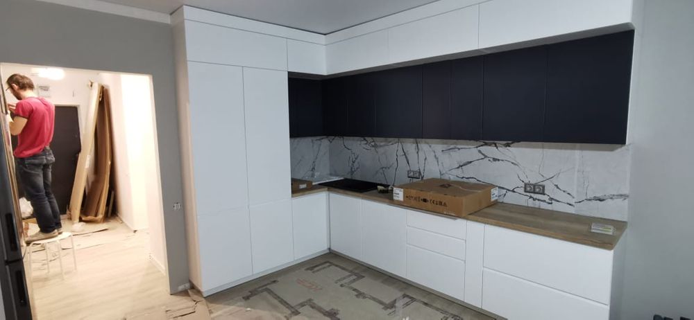 у меня нет симметрии верх-низ. но верх разделили ровно по центру. примерно похожая планировка (зеркально) НО! у меня нет вытяжки, поэтому я к ней не привязывалась в планировке шкафов..