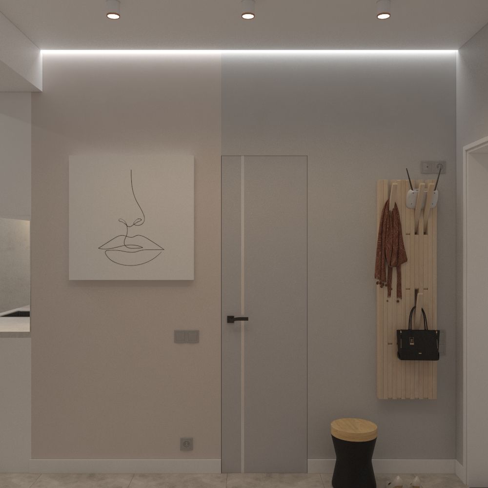 В коридоре небольшая настенная вешалка и пуф. Между дверьми в гардеробную и в спальню разместили вместительную обувницу.