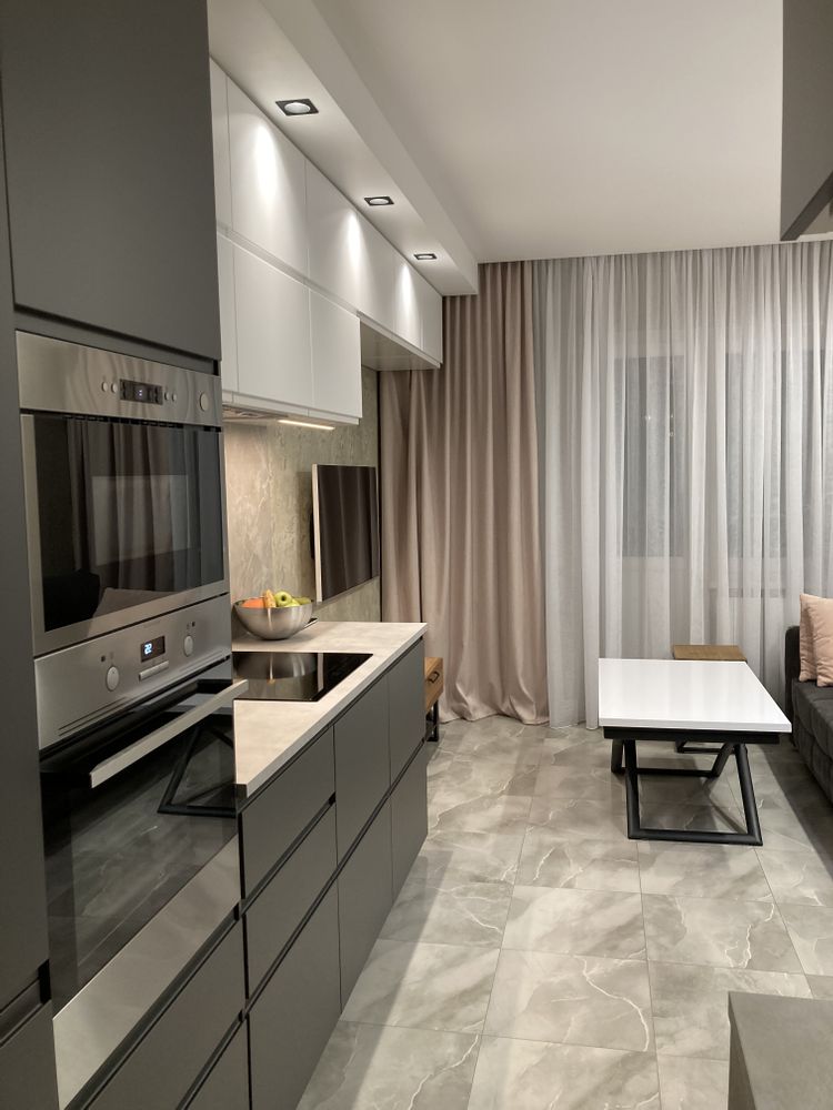 Кухню-гостиную сделала без обеденного стола или барной стойки. Точнее стол есть) Он журнальный, но раскладывается до полноценного обеденного. По короткой стене размещены ПММ, шкаф с мойкой и стиральная машина. По длиной стене остальной кухонный гарнитур переходящий в гостиную зону.
