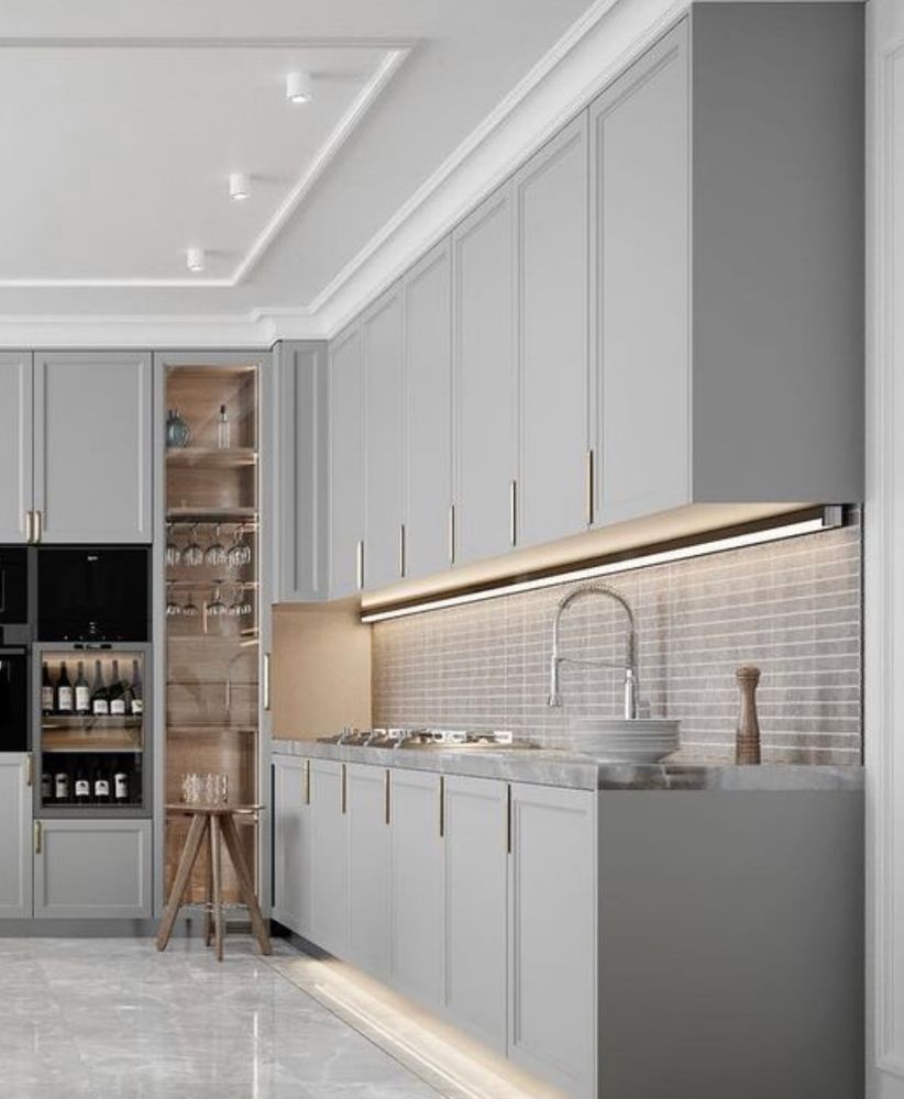 Я делала кухню чисто под себя. Я не высокая и решила вообще не делать верхние шкафы. Получилось очень хорошо. Всё,на удивление , поместилось. Хотя когда проект сделали, у меня были сомнения. Пользуюсь уже 2 года и очень довольна таким решением.