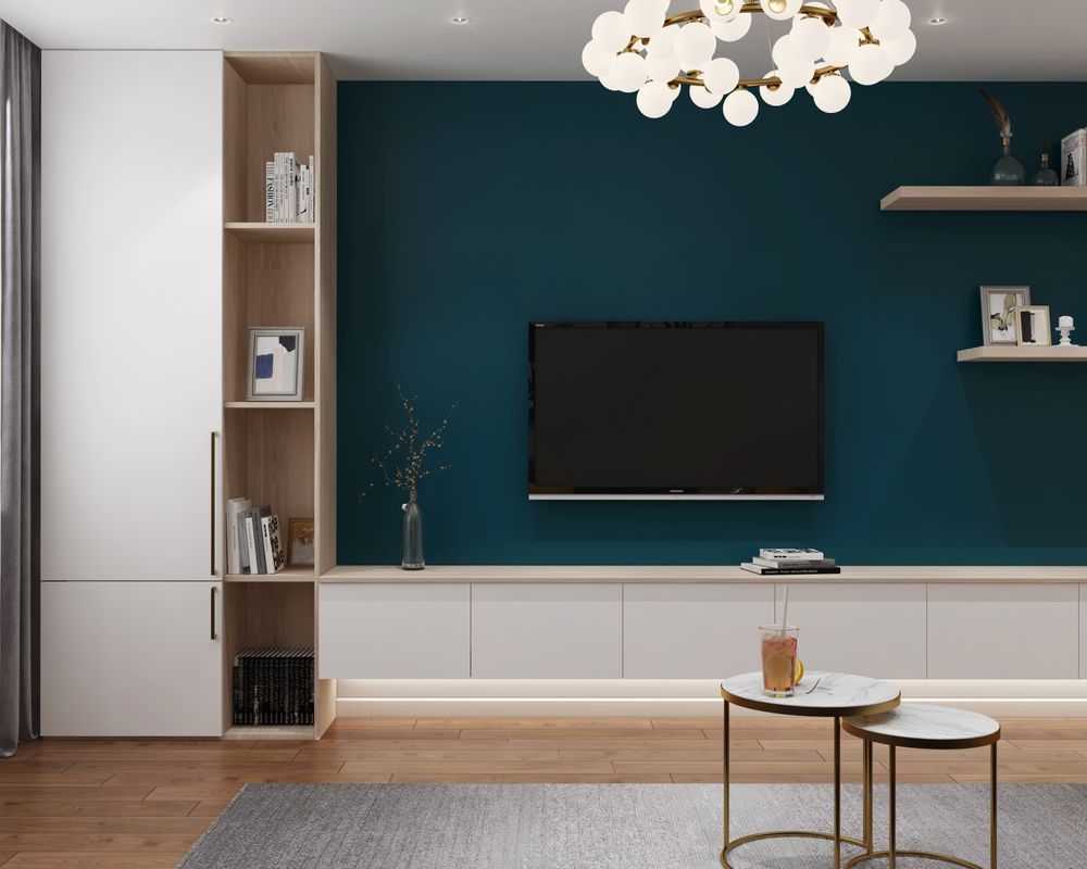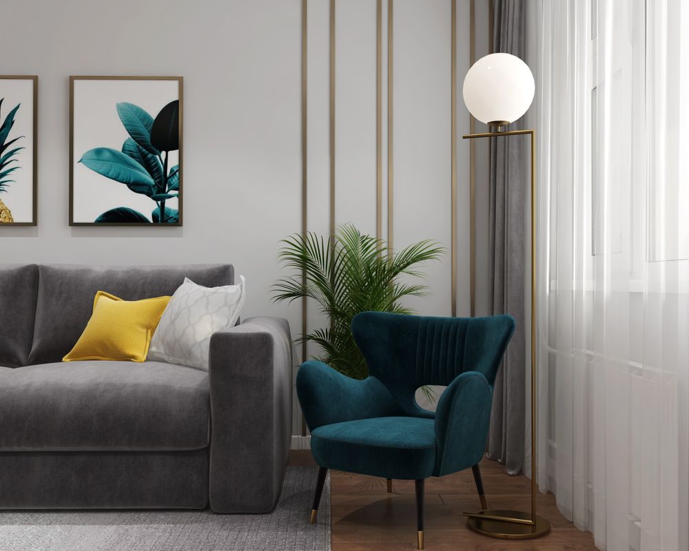 В гостиной в качестве акцента использовался глубокий изумрудный цвет.