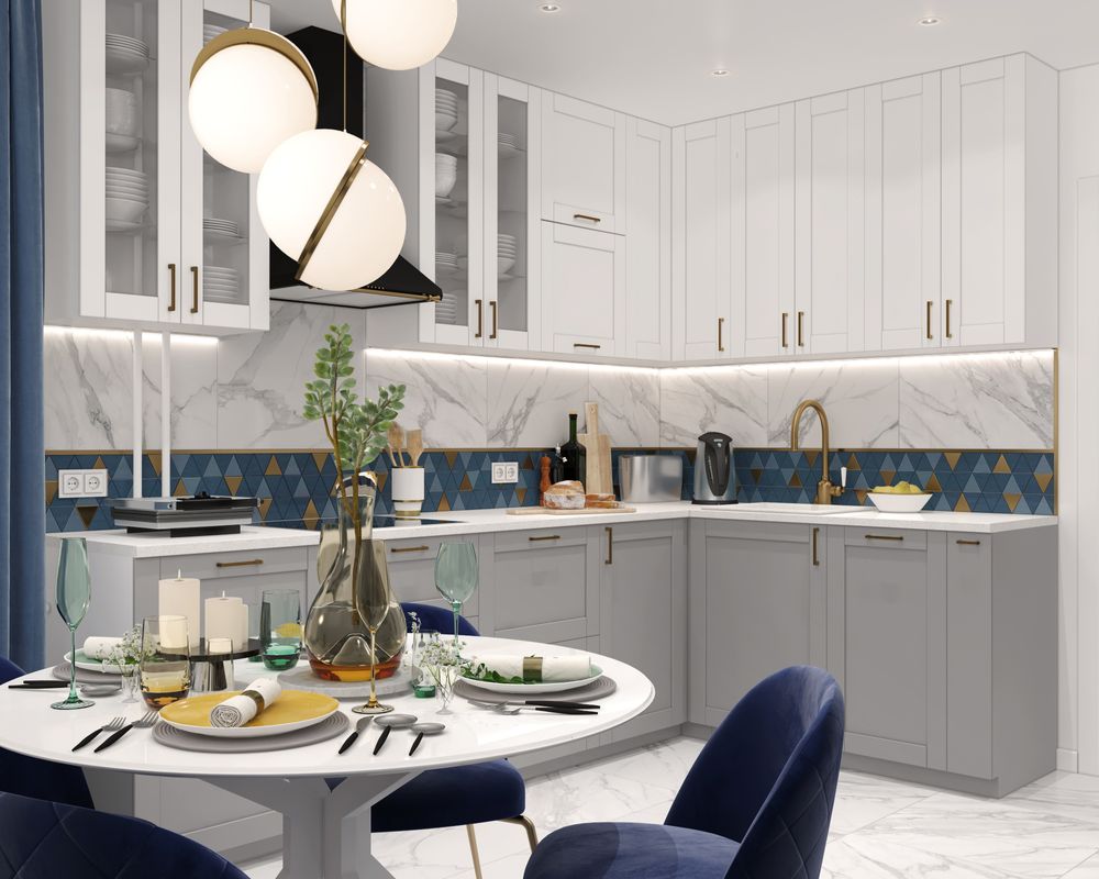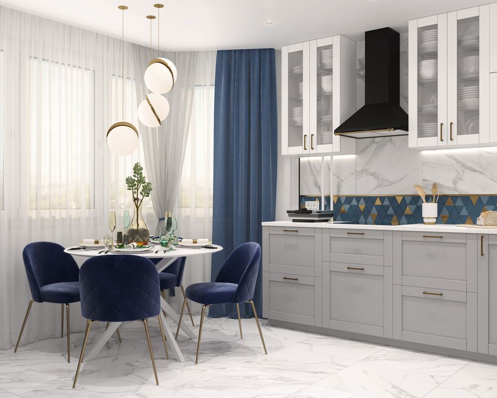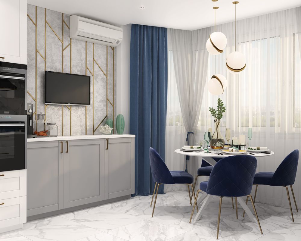 На кухне доминирующим цветом стал насыщенный синий. Также в оформлении используются золотистые элементы, которые повторяются в каждой комнате. Круглый стол идеально вписался в солнечный эркер.