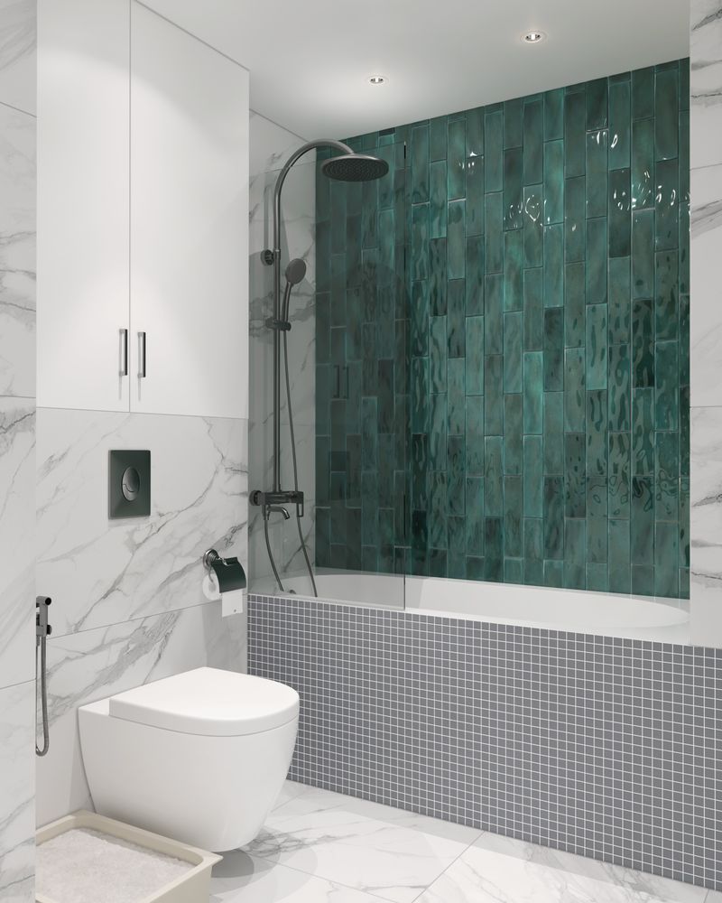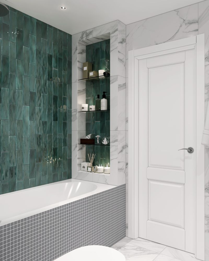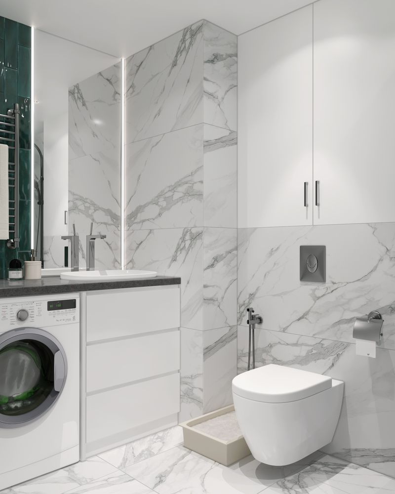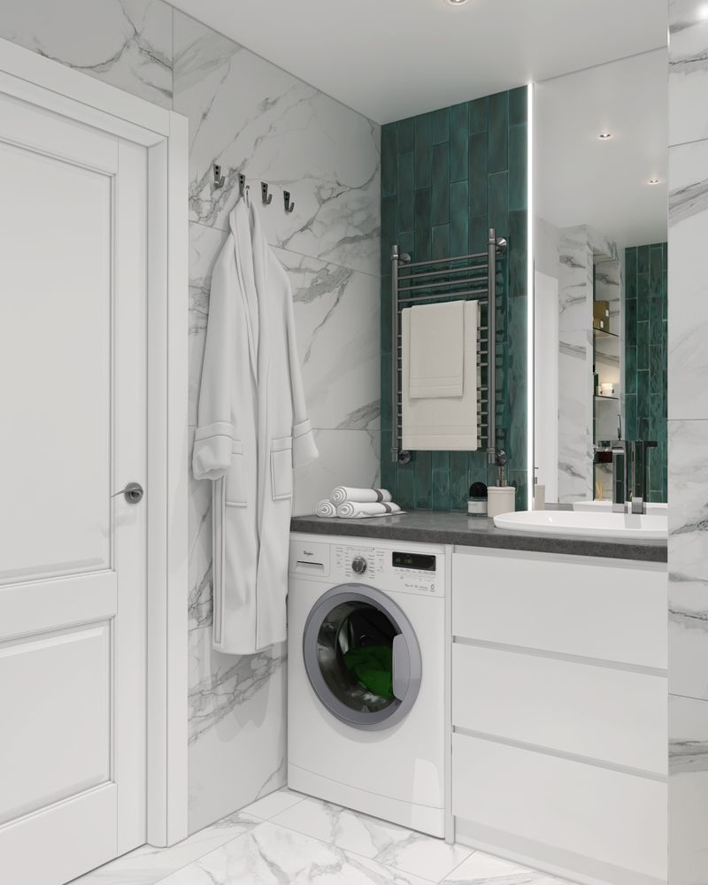 В санузлах для акцента использовали насыщенную изумрудную плитку. База - все та же плитка под мрамор. Стиральная машинка размещена под единой столешницей с раковиной. Визуально такое решение смотрится более целостным и гармоничным.