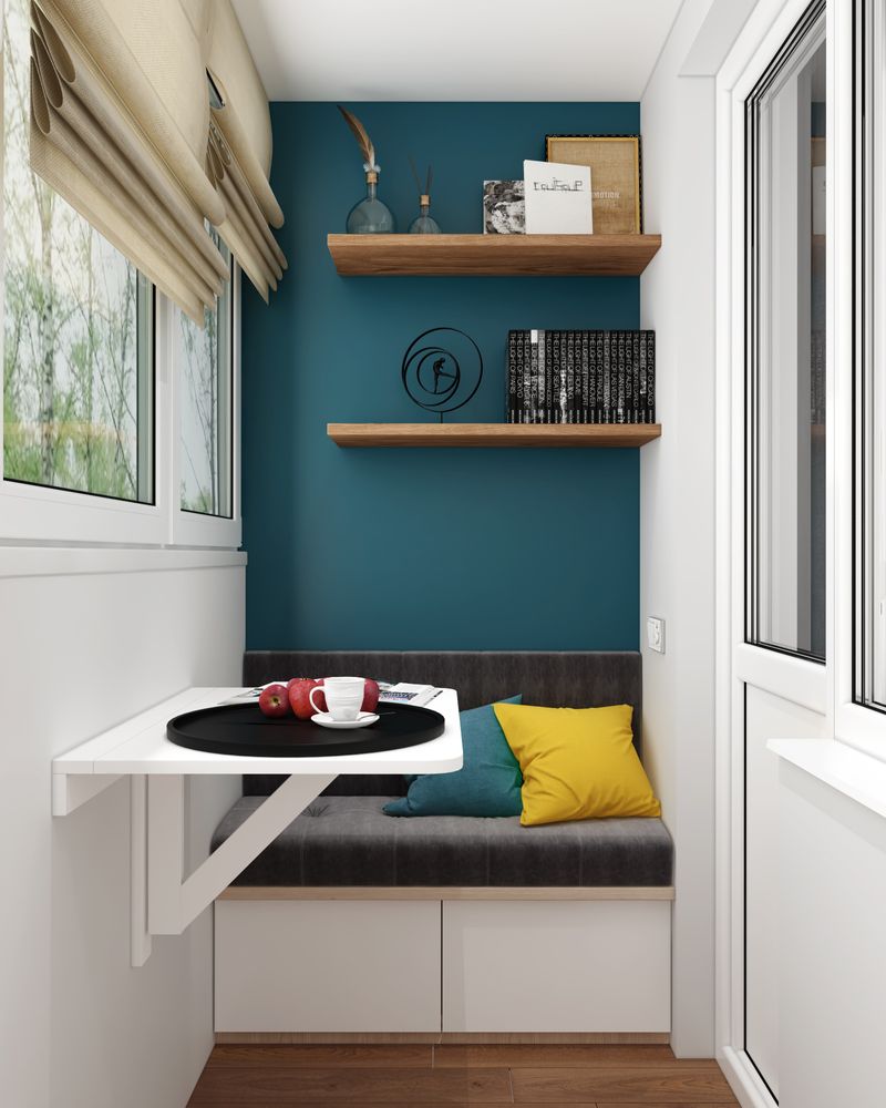 Из этой комнаты можно попасть на небольшой балкончик, его мы тоже облагородили и сделали там уютный уголок для посиделок.