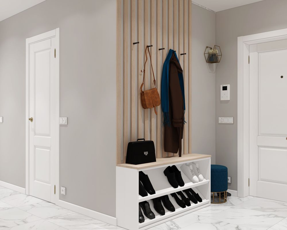 Не смотря на скромные размеры прихожей, место в ней удалось использовать по максимуму. Также чуть дальше по коридору находится небольшой встроенный шкаф.