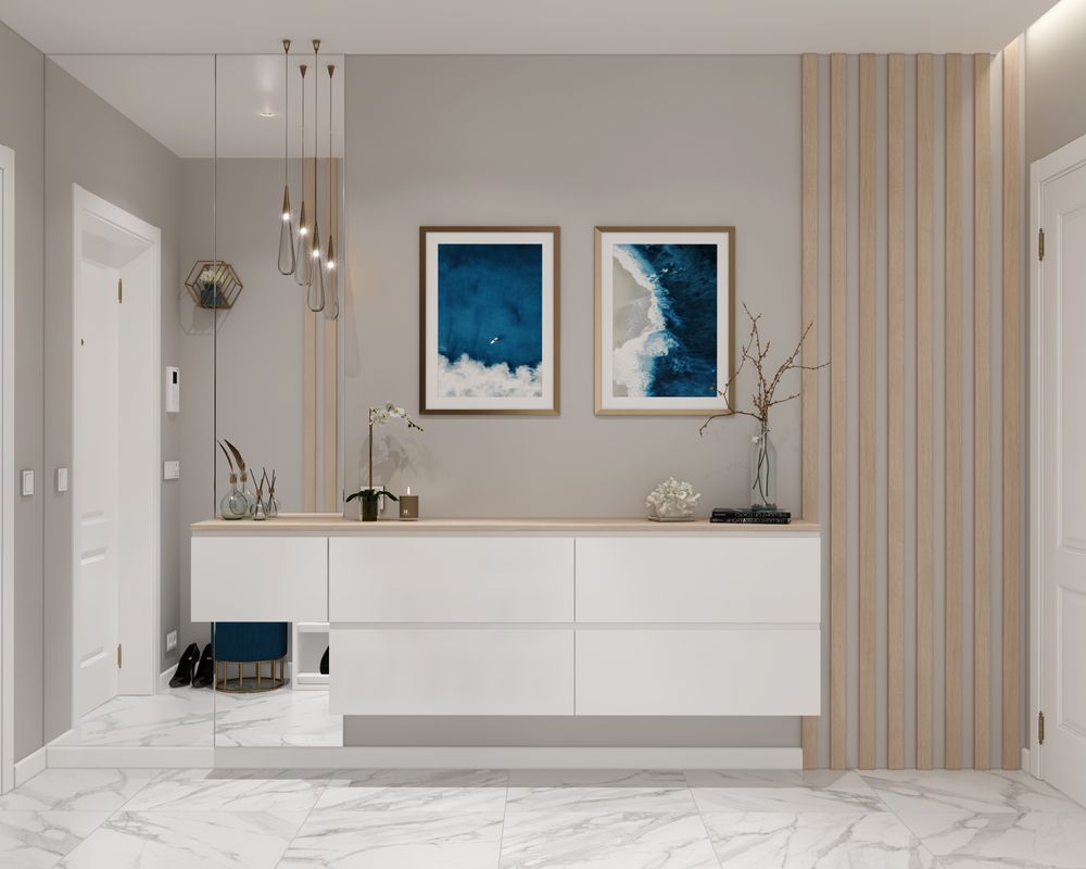 В прихожей использована та же плитка с мраморной текстурой. Яркие постеры над подвесной тумбой здорово оживляют интерьер.