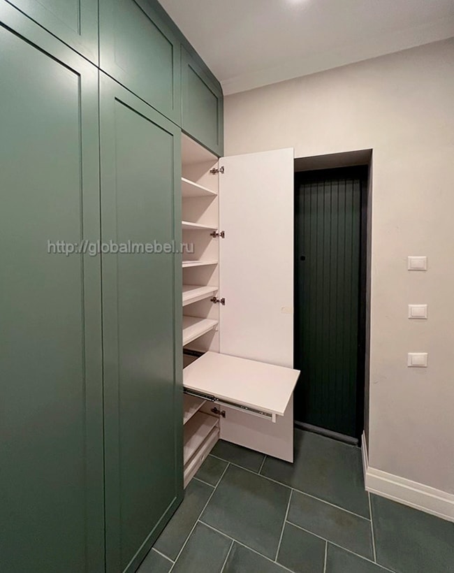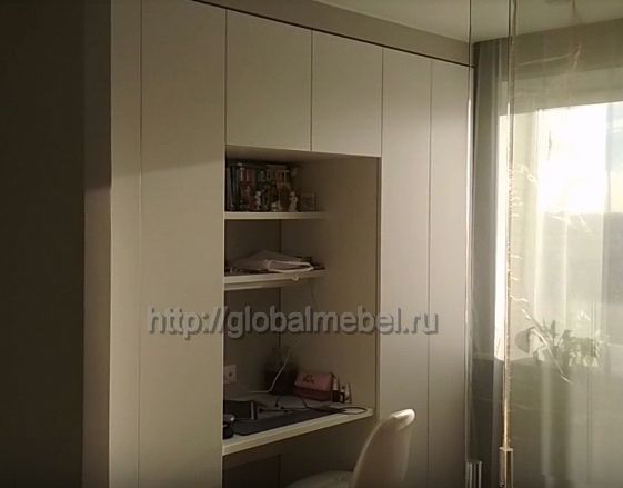 Шкаф-стенка с фасадами из МДФ под эмалью со встроенным столом: длина 2,4 м, стоимость 110000 рублей. Окраска в любой цвет.
