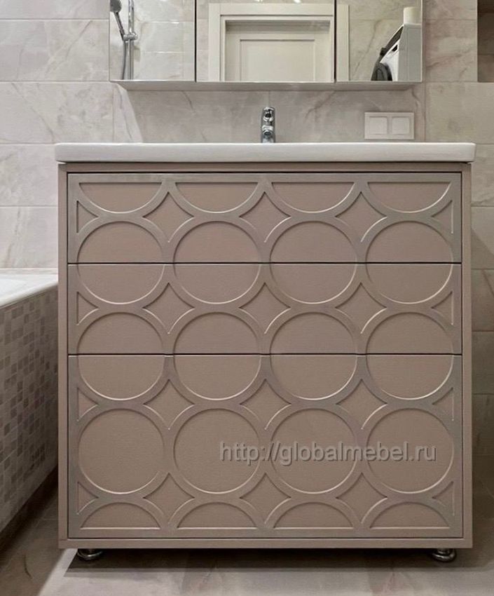 Тумба для ванной Кольца с фасадами из МДФ под эмалью и с серебристой патиной. Размеры: ширина 0,8*высота 0,9*глубина 0,45 м, стоимость 58700 рублей, можно выбрать другие габариты. Изготавливается в подвесном виде или на ножках.
