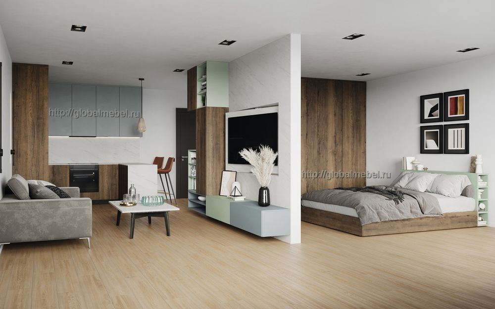 Кухня, шкафы, тумбы и кровать из ЛДСП Egger для студии: комплексное оснащение, любые размеры. 200 расцветок.