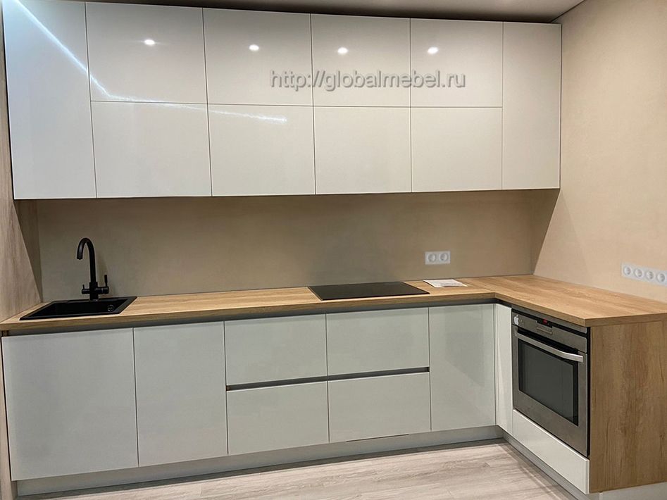 Кухня Белый Глянец Gola с фасадами из пластика Arpa: длина кухни на фото 3,2*1,35 м, стоимость от 288750 р. Используется профиль Gola, который создает за дверцей нишу. Для открытия нужно захватывать сам фасад. 200 расцветок.