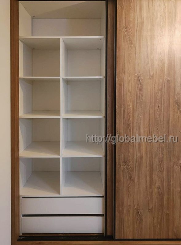 Раздвижная система дверей: Avira с доводчиком. Выдвижные ящики: Hettich (Германия). Ручки: Neo. Также предлагаем посмотреть 3D-проект шкафа в цвете.