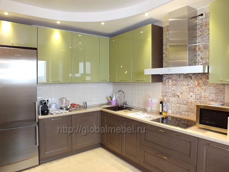 Кухню можно выполнить из разных материалов в зависимости от бюджета, которым располагаете на покупку кухни. Например, такая кухня может быть выполнена с различными вариантами фасадов.