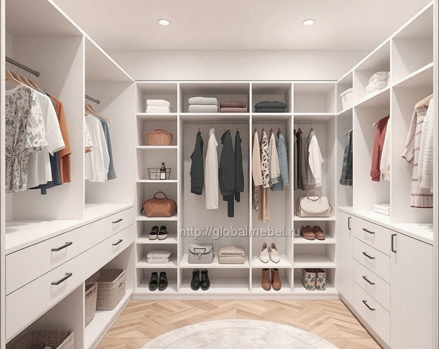 Гардеробная из ЛДСП Egger Белый Премиум с полками в нише: длина 1,8*2*1,5 метра, стоимость 261500 рублей, любые нужные размеры. 200 расцветок.