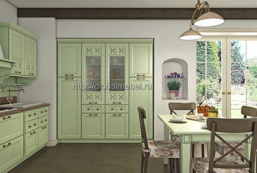 Кухня Прованс Дуб зеленый с российскими фасадами из дерева, цвет Фисташка: длина 3,4*2 м, стоимость 482160 р. Окраска в любой цвет.